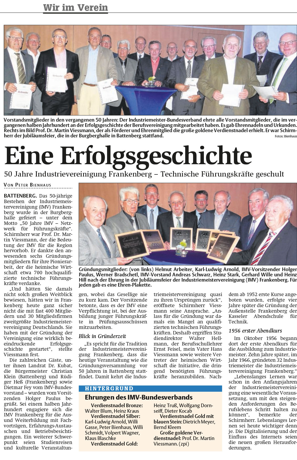 Über dieses halbe Jahrhundert engagierte sich die IMV Frankenberg für die Aus- und Weiterbildung mit Fachvorträgen, Erfahrungs-Austauschen und Betriebsbesichtigungen. Ein weiterer Schwerpunkt waren Studienreisen und kulturelle Veranstaltungen, wobei das Gesellige nie zu kurz kam. Der Vorsitzende betonte, dass es der IMV eine Verpflichtung ist, bei der Ausbildung junger Führungskräfte in Prüfungsausschüssen mitzuarbeiten. Allen Mitgliedern werde ein informatives und abwechslungsreiches Jahresprogramm geboten, das einen regen Zuspruch findet.