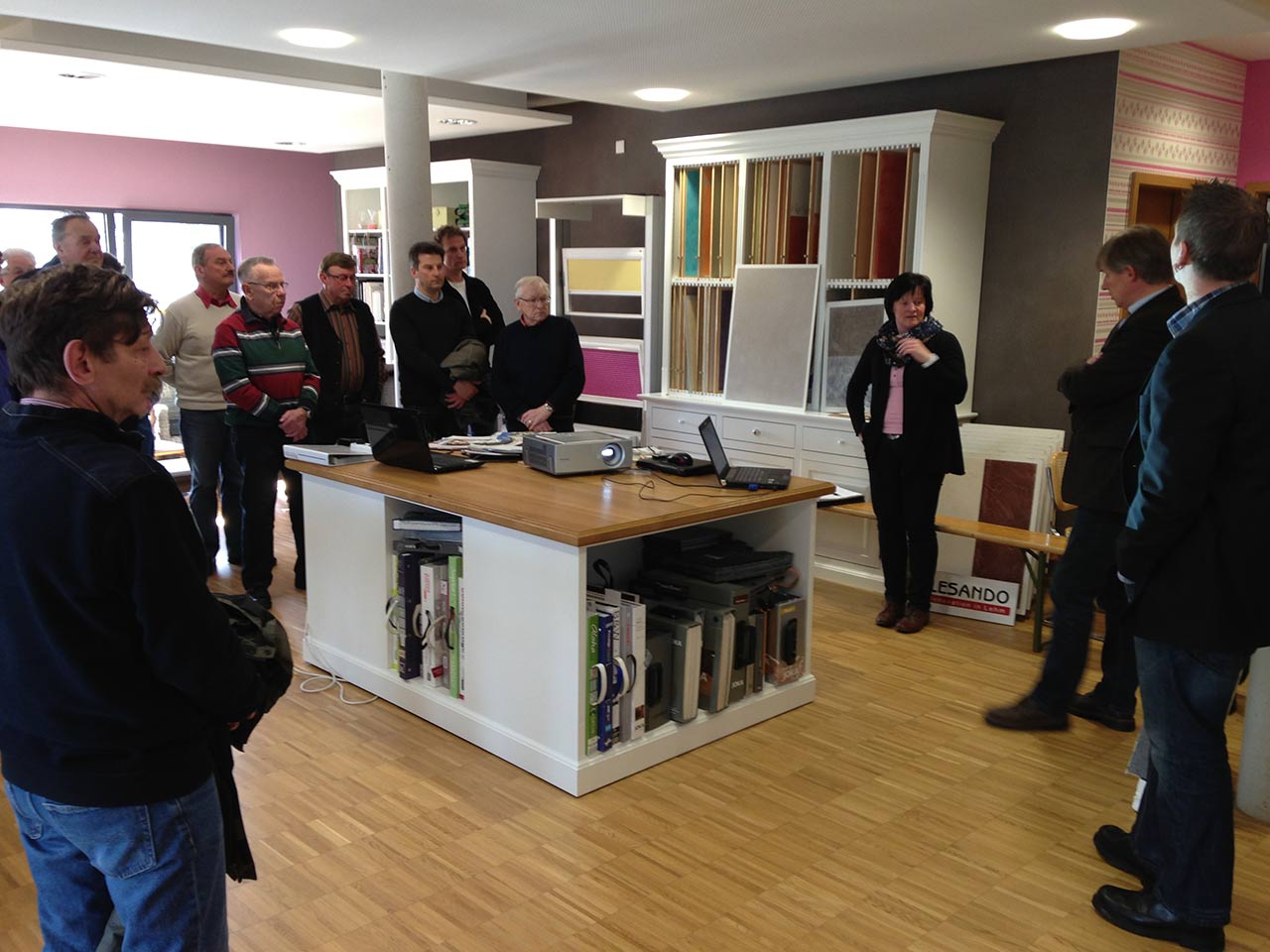 Am 26.03.13 besuchte die Industriemeistervereinigung Frankenberg/ Eder, den Maler – und Werbetechnikbetrieb Bienhaus. Ca. 35 Mitglieder wurden durch die in 2009 neu erbaute Ausstellungshalle geführt. Vom Putz über Tapeten, Bodenbeläge und Werbetechniken konnten die Mitglieder Einblick erhalten. Im Anschluss referierte Frank Dornseif von der Fa. Brillux, über Wärmeverbundsysteme. Hier ging es speziell um Wärmeverluste, Heizenergie sparen, Beitrag zum Umweltschutz und Verbesserung der Wohnqualität. Anschließend berichtete Dirk Bienhaus „ Energieberater“ der Firma Enertix über aktuelle Themen der Wohngebäudesanierung. Von der Analyse des Bestandes, Vorschläge für energiesparende Maßnahmen, Ermittlung der Kosten und Aussagen zu Förderprogramme beinhalteten seinen Vortrag. Bei Kaffee und Kuchen konnten weitere Fragen an die Referenten gestellt werden. Die Industriemeistervereinigung Frankenberg möchte sich bei der Fa. Bienhaus, insbesondere bei der Inhaberin Meike Bienhaus - Blaschke, für die Einladung bedanken.