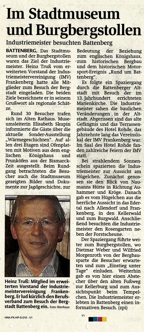 Industriemeister besuchten Battenberg. Battenberg. Das Stadtmuseum und der Burgbergstollen waren das Ziel der Industriemeister. Heinz Truß vom erweiterten Vorstand der Industriemeistervereinigung (IMV) Frankenberg hatte alle Mitglieder zum Besuch Bergstadt eingeladen.
