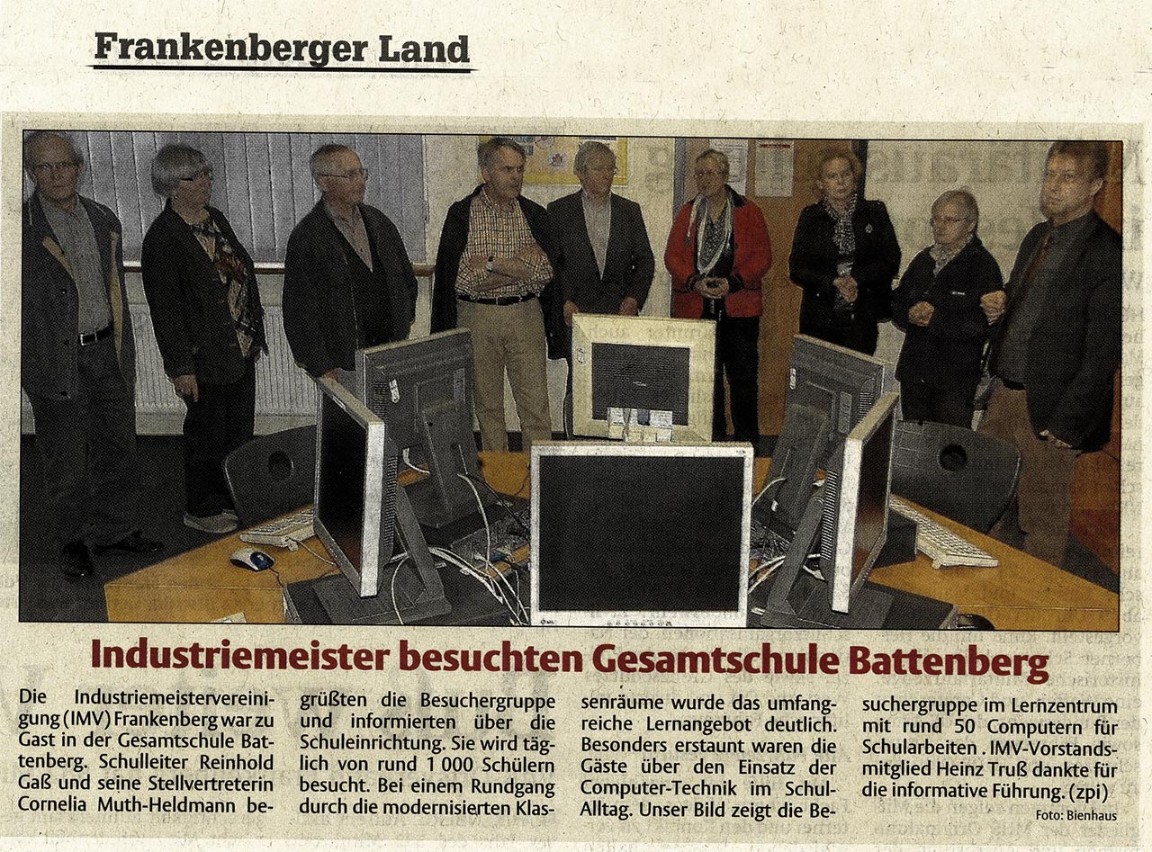 Industriemeister besuchten Gesamtschule Battenberg. Die Industriemeistervereinigung (IMV) Frankenberg war zu Gast in der Gesamtschule Battenberg. Schulleiter Reinhold Gaß und seine Stellvertreterin Cornelia Muth-Heldmann begrüßten die Besuchergruppe und informierte über Schuleinrichtung.
