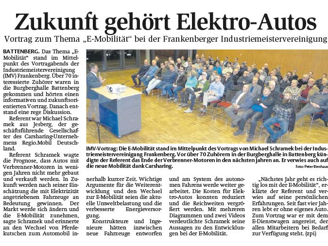 BATTENBERG. Das Thema „EMobilität“ stand im Mittelpunkt des Vortragabends der Industriemeistervereinigung (IMV) Frankenberg. Über 70 interessierte Zuhörer waren in die Burgberghalle Battenberg gekommen und hörten einen informativen und zukunftsorientierten Vortrag. Danach entstand eine rege Diskussion. Referent war Michael Schramek aus Jesberg, der geschäftsführende Gesellschafter des Carsharing-Unternehmens Regio.Mobil Deutschland. Referent Schramek wagte die Prognose, dass Autos mit Verbrenner-Motoren in wenigen Jahren nicht mehr gebaut und verkauft werden. In Zukunft werden nach seiner Einschätzung die mit Elektrizität angetriebenen Fahrzeuge an Bedeutung gewinnen.