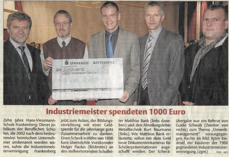 Vortragsabends gratulierte die IMV Frankenberg der Hans Viessmann-Schule zum